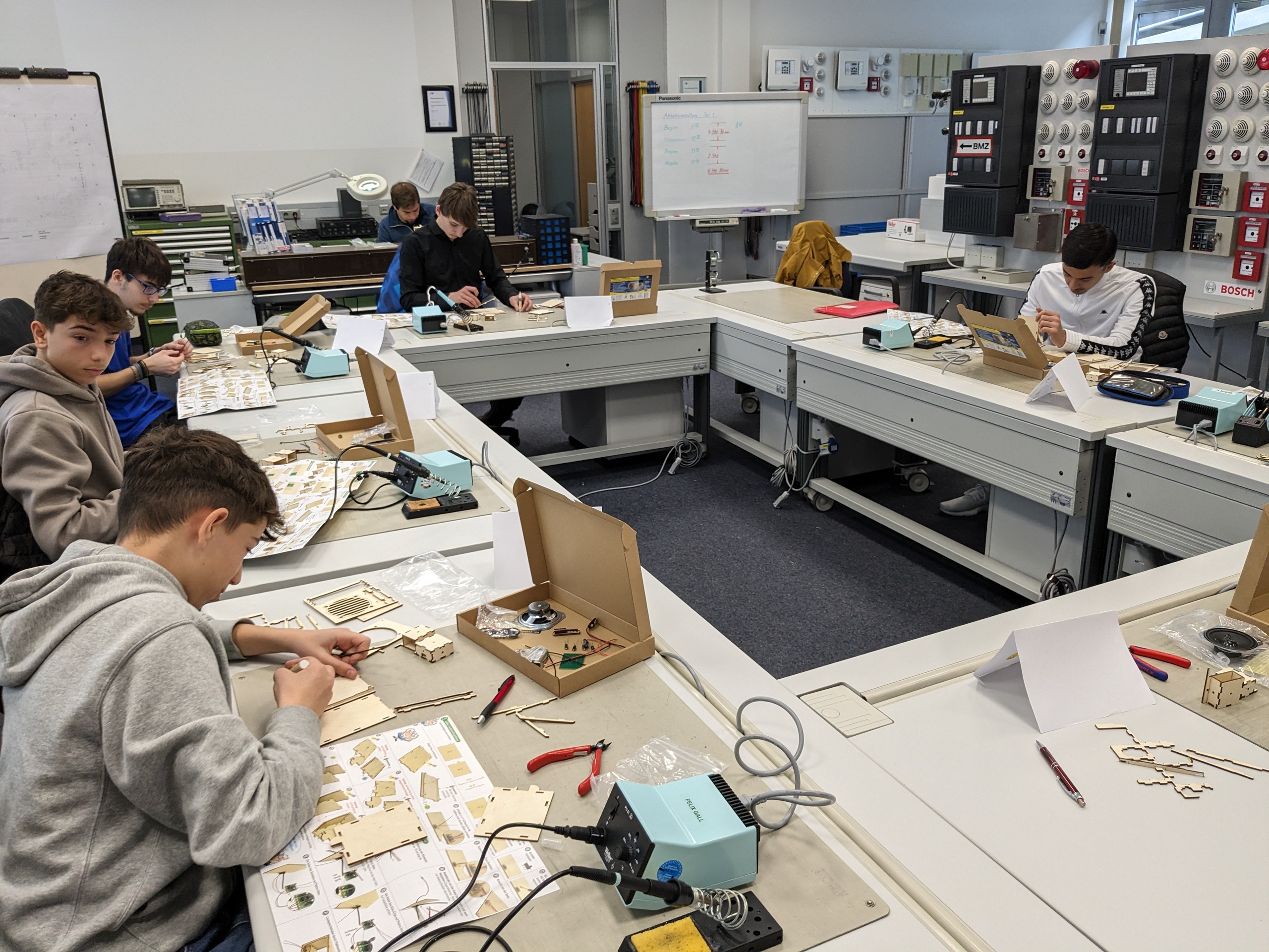 Nachdem wir vergangenes Jahr wieder unsere langjährige Kooperation mit der Firma BOSCH Sicherheitssysteme aufgenommen haben, ging es nach Corona in Runde 2. Wie jedes Jahr war es uns ein Anliegen interessierten Schülerinnen und Schülern einen Einblick in die Praxis zu ermöglichen. Hierzu haben sich folgende Schüler der 9. Klassenstufe Daniel Tumback, Ioannis Kiosses, Andy Ngo, Franco Sotrino, Vincenzo Storino, Furkan Al und Dijar Afizi für einen Besuch der Ausbildungsstelle Weilimdorf angemeldet. Vor Ort durften die Schüler eine Musik-Lautsprecher-Box selbst herstellen und im Anschluss daran auch mitnehmen. Beim Bau der Lautsprecherbox mussten die Schüler somit ihre praktische Fähigkeiten unter Beweis stellen. Das Löten einer Platine entspricht zwar weniger der täglichen Arbeit eines Elektronikers für Informations- und Systemtechnik – der Beruf den junge Erwachsene bei BOSCH ST lernen können – bietet aber eine gute Grundlage um wichtige Kenntnisse im Bereich der Elektronik aufzubauen.