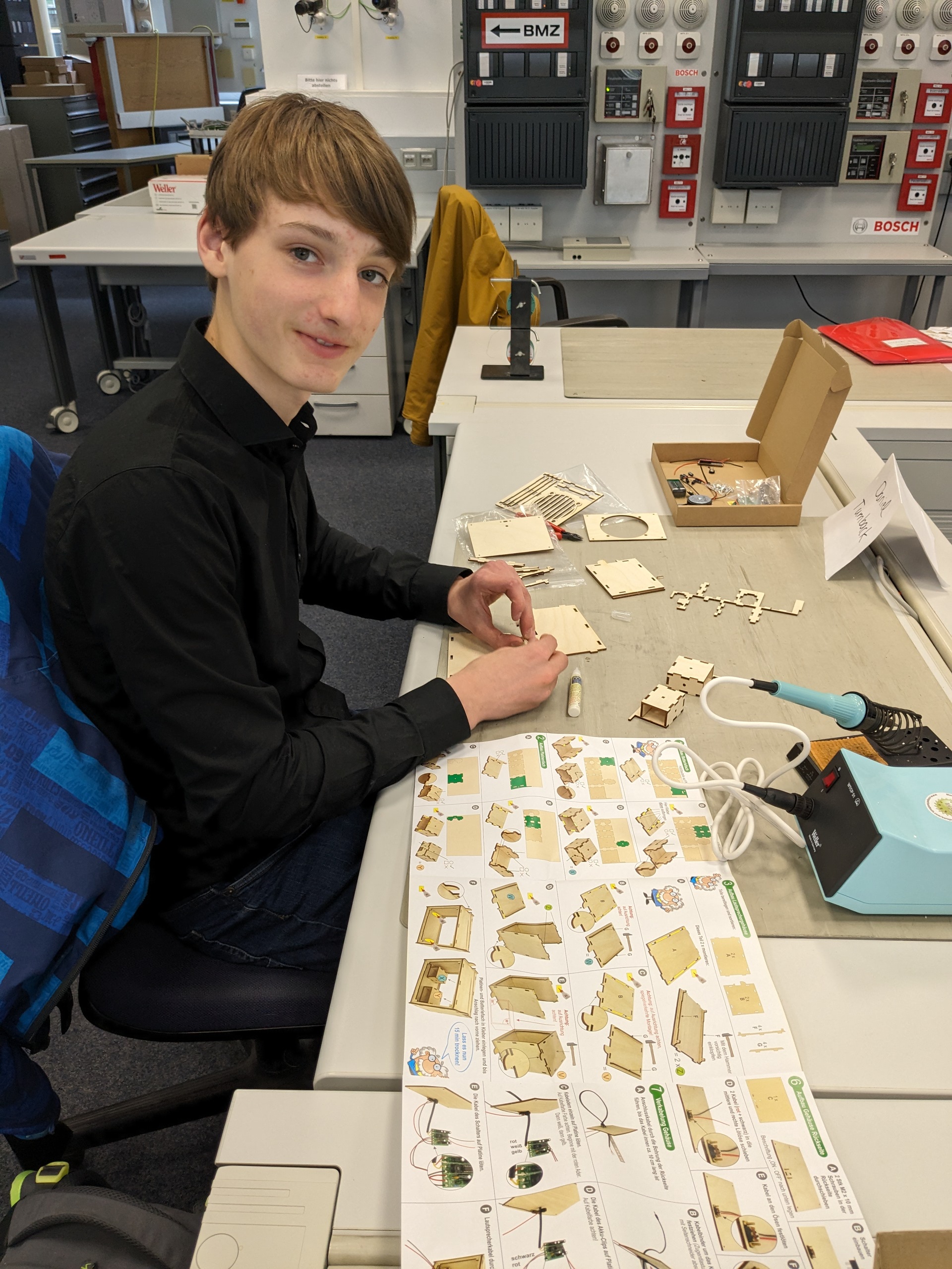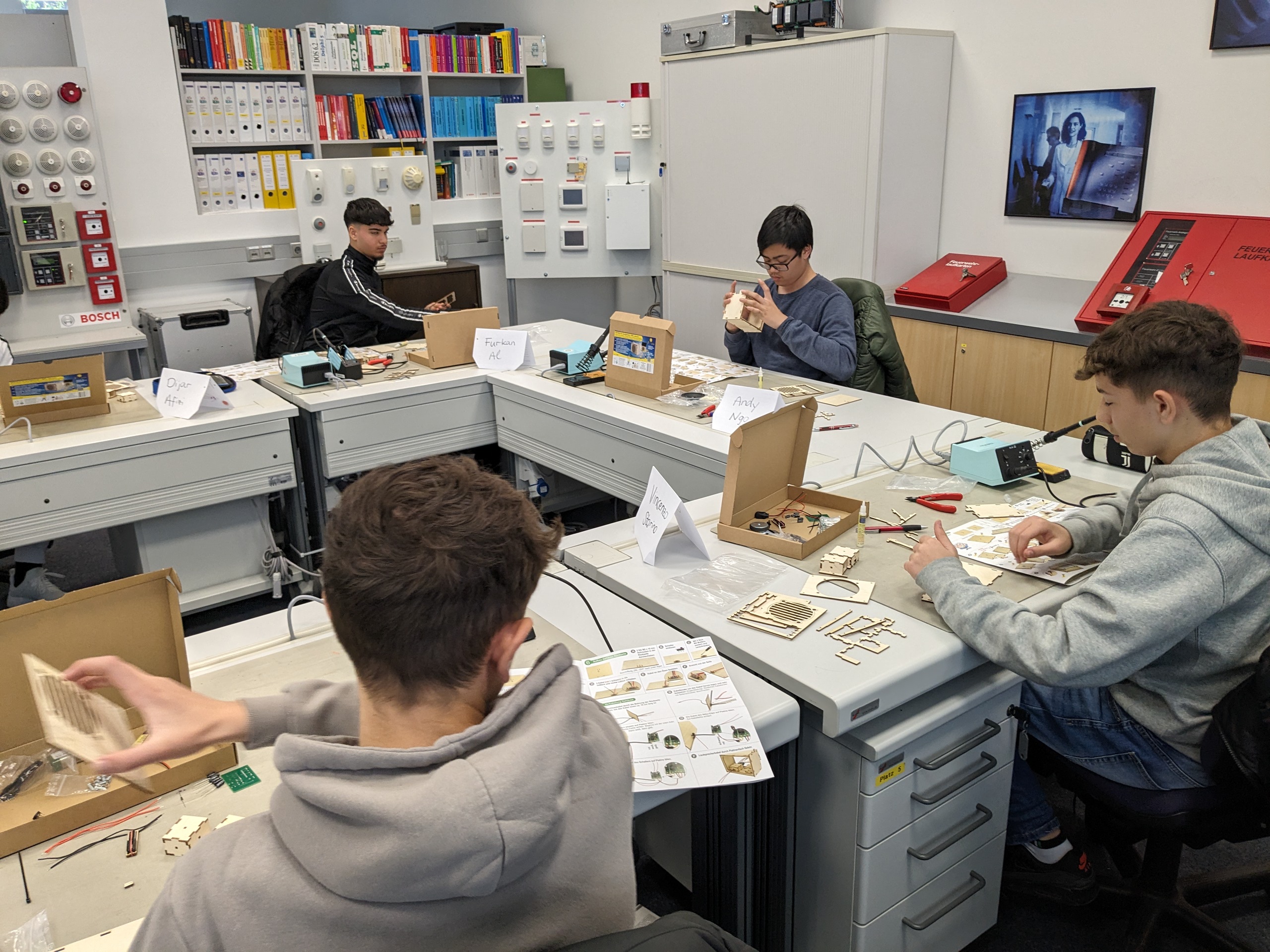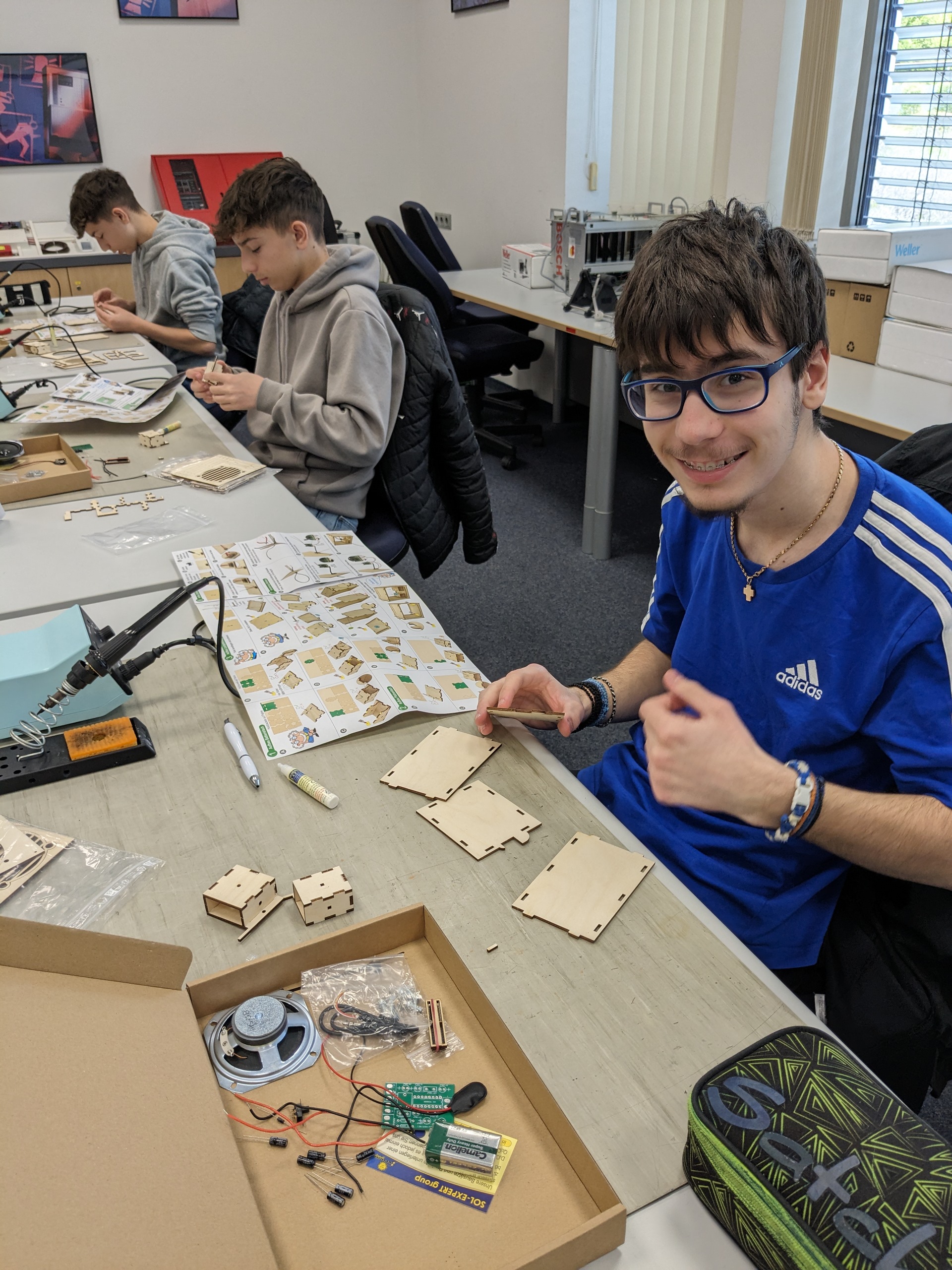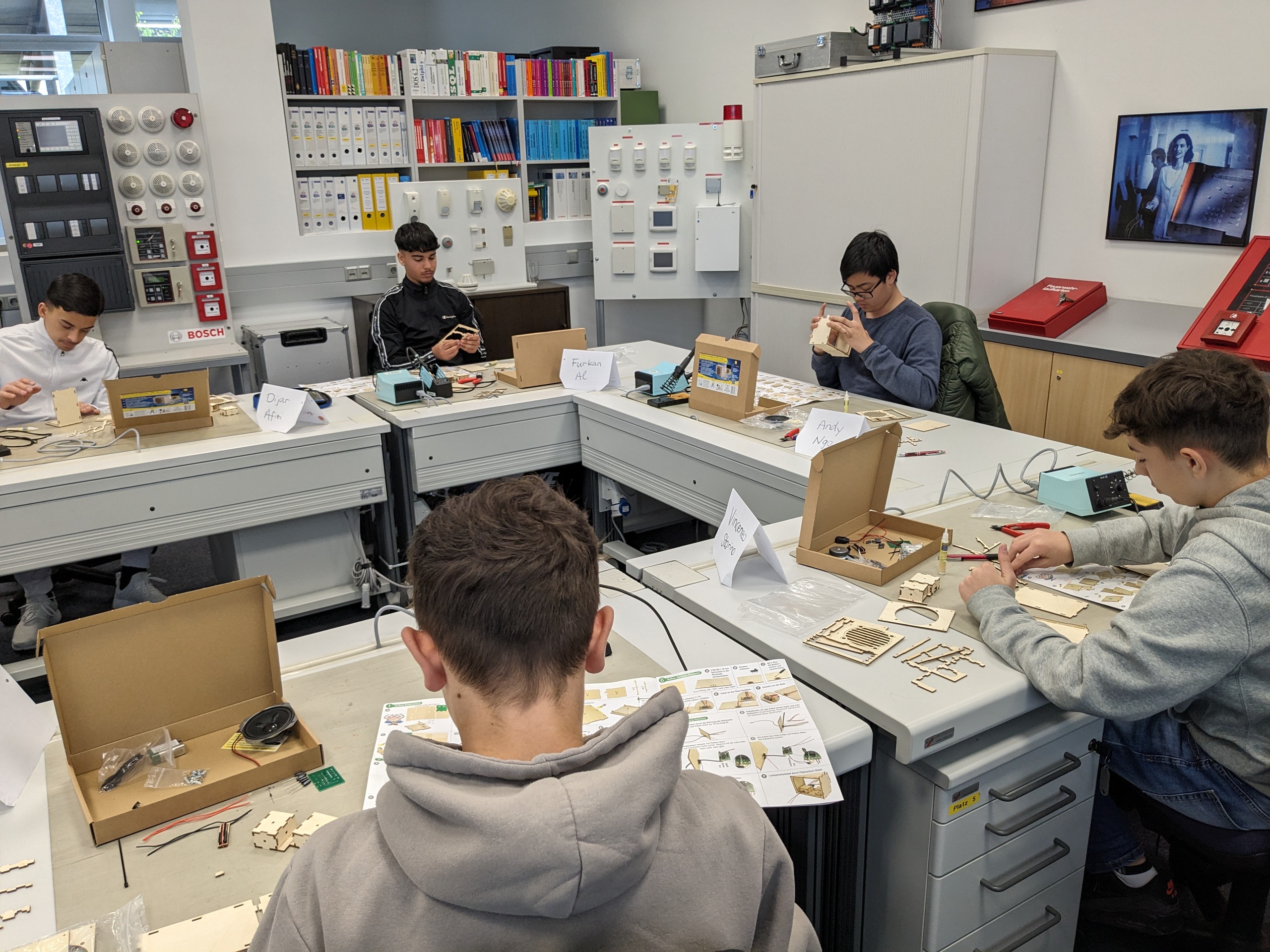 Nachdem wir vergangenes Jahr wieder unsere langjährige Kooperation mit der Firma BOSCH Sicherheitssysteme aufgenommen haben, ging es nach Corona in Runde 2. Wie jedes Jahr war es uns ein Anliegen interessierten Schülerinnen und Schülern einen Einblick in die Praxis zu ermöglichen. Hierzu haben sich folgende Schüler der 9. Klassenstufe Daniel Tumback, Ioannis Kiosses, Andy Ngo, Franco Sotrino, Vincenzo Storino, Furkan Al und Dijar Afizi für einen Besuch der Ausbildungsstelle Weilimdorf angemeldet. Vor Ort durften die Schüler eine Musik-Lautsprecher-Box selbst herstellen und im Anschluss daran auch mitnehmen. Beim Bau der Lautsprecherbox mussten die Schüler somit ihre praktische Fähigkeiten unter Beweis stellen. Das Löten einer Platine entspricht zwar weniger der täglichen Arbeit eines Elektronikers für Informations- und Systemtechnik – der Beruf den junge Erwachsene bei BOSCH ST lernen können – bietet aber eine gute Grundlage um wichtige Kenntnisse im Bereich der Elektronik aufzubauen.