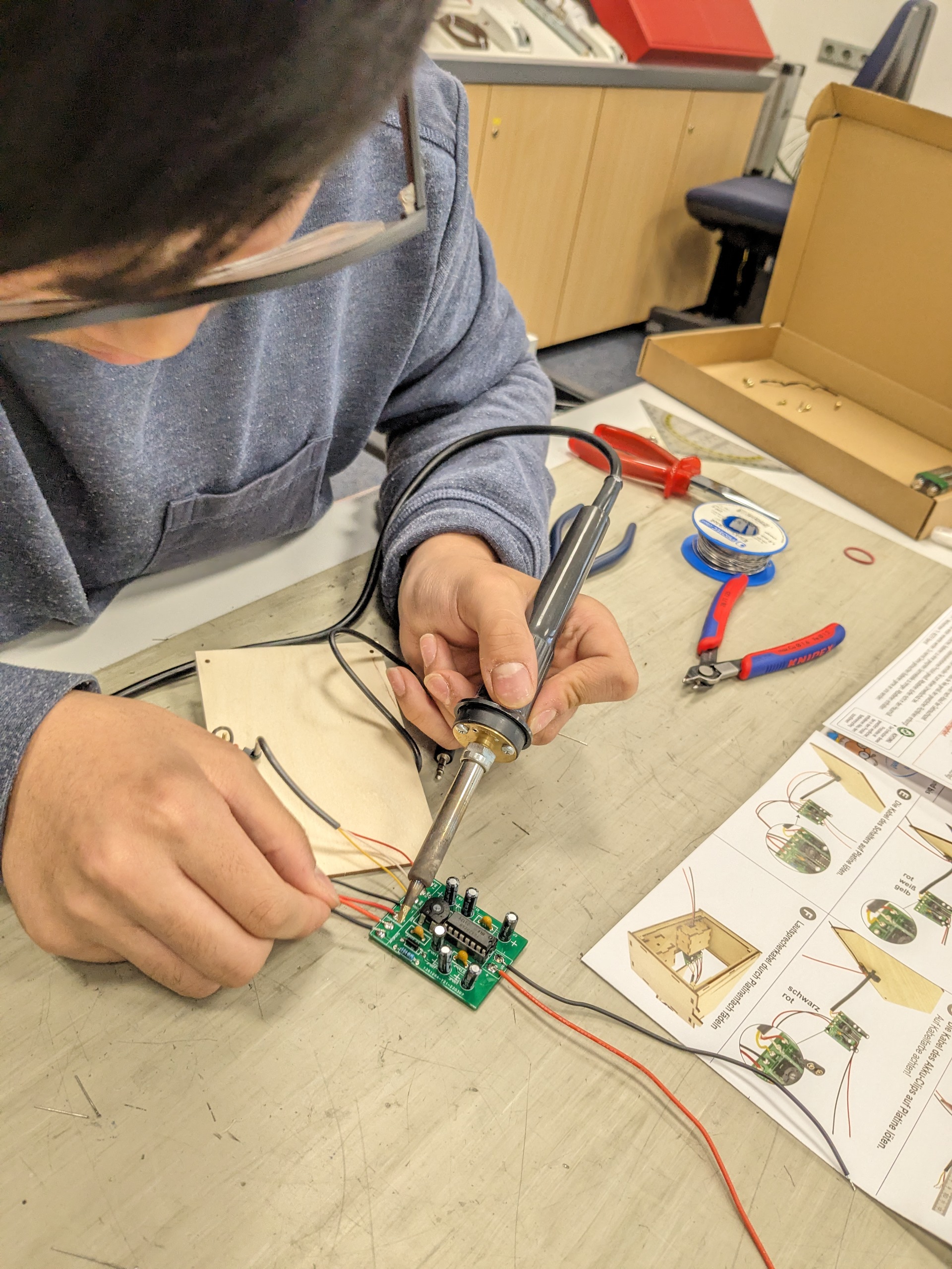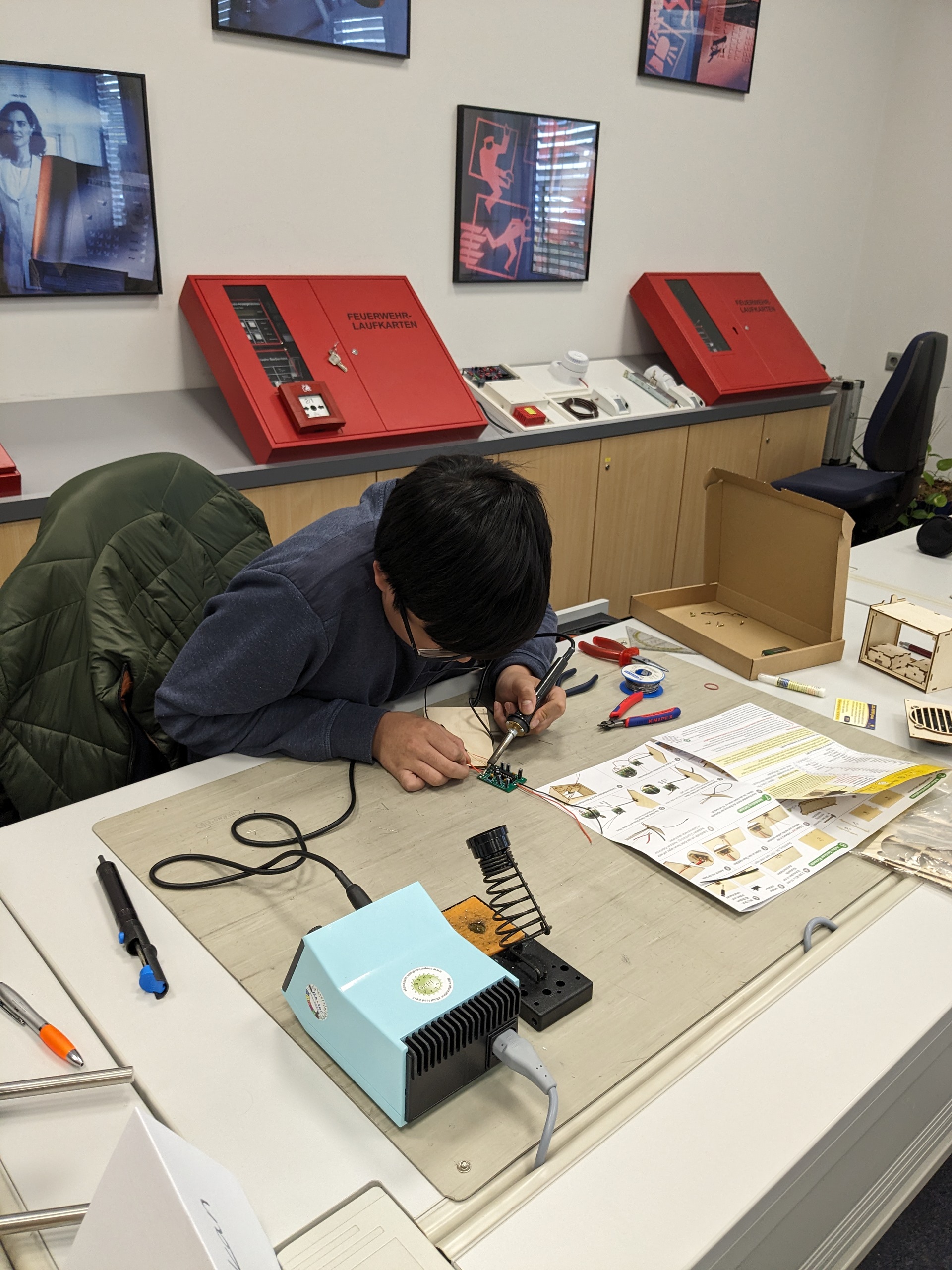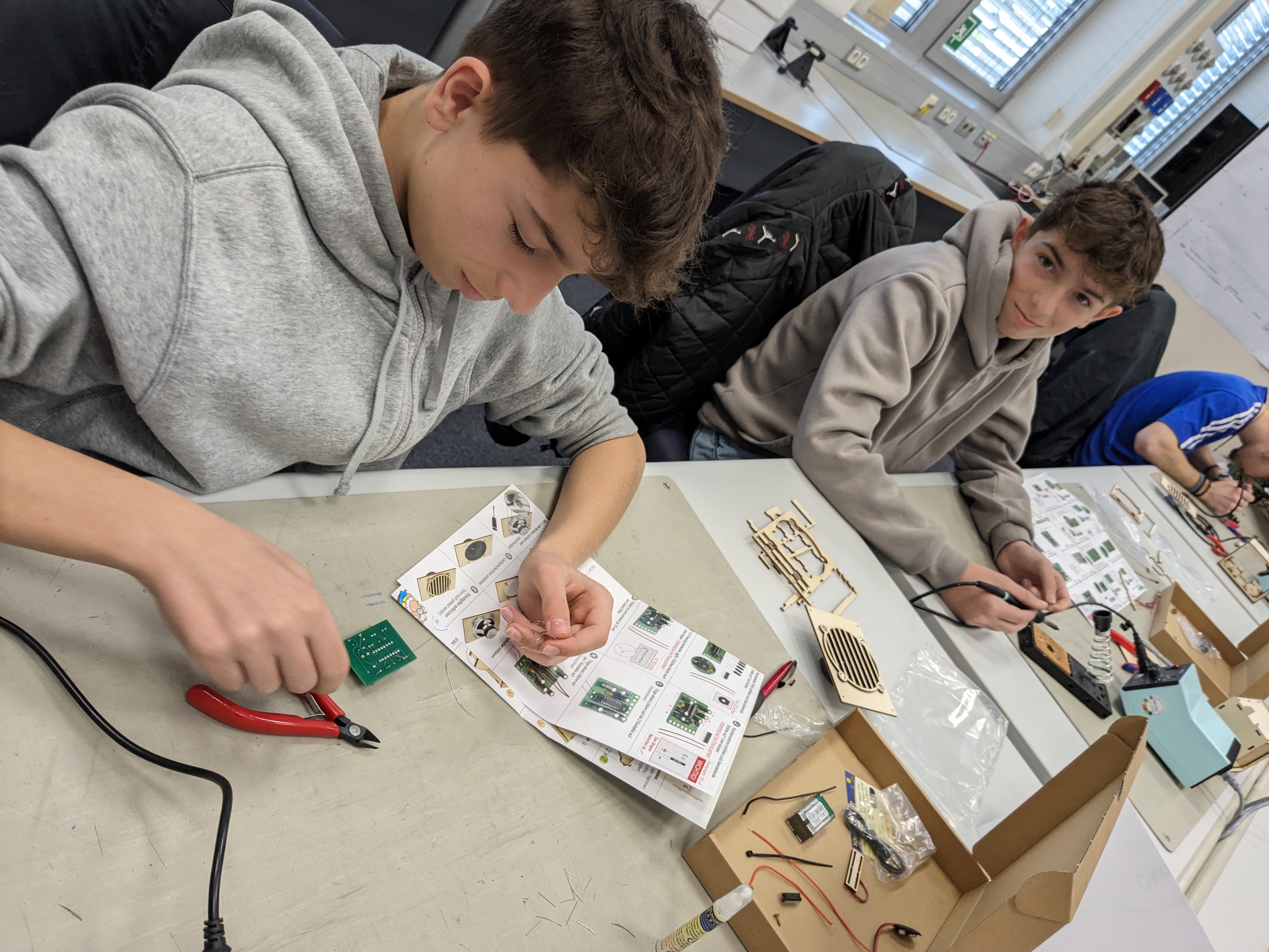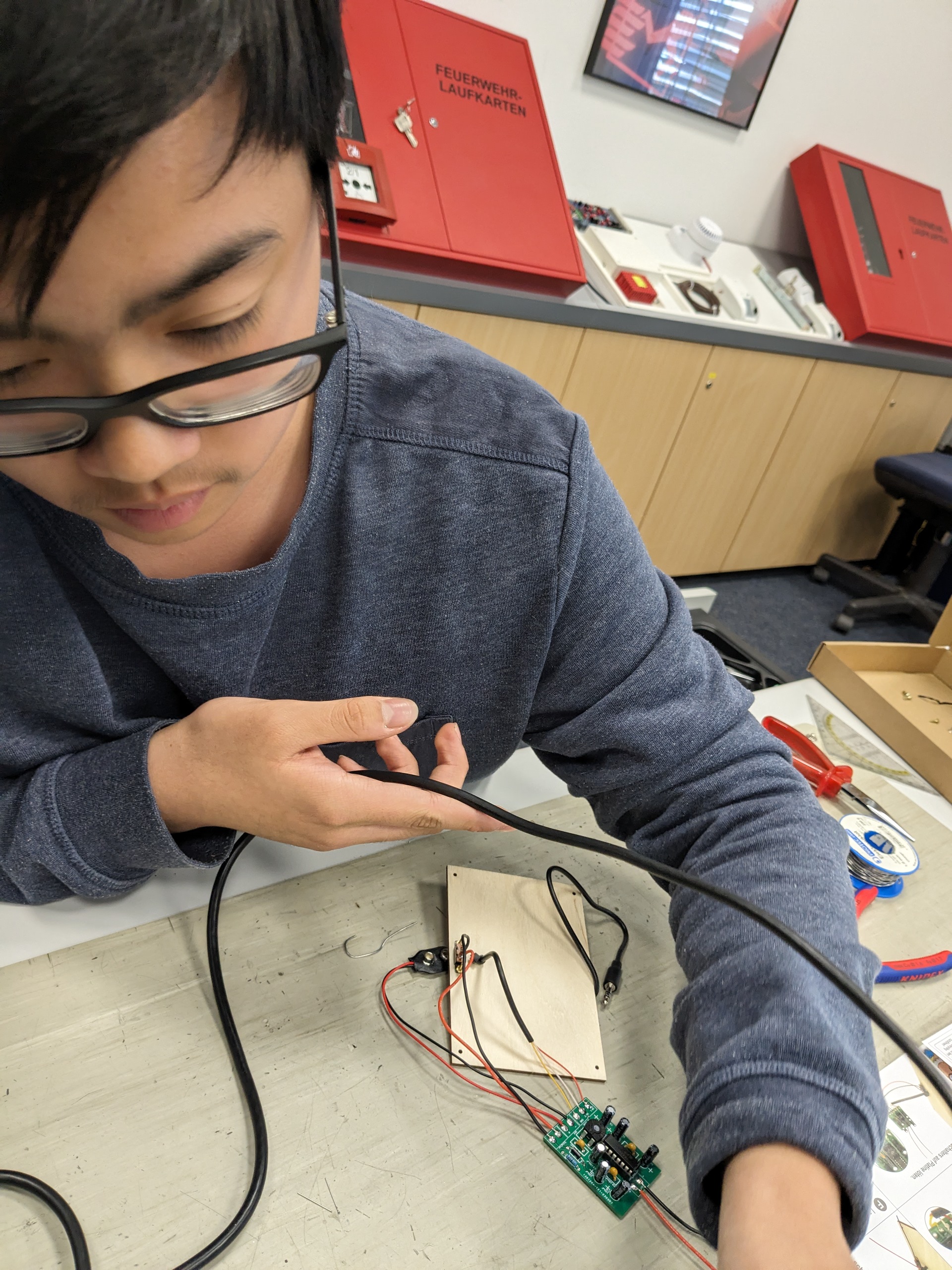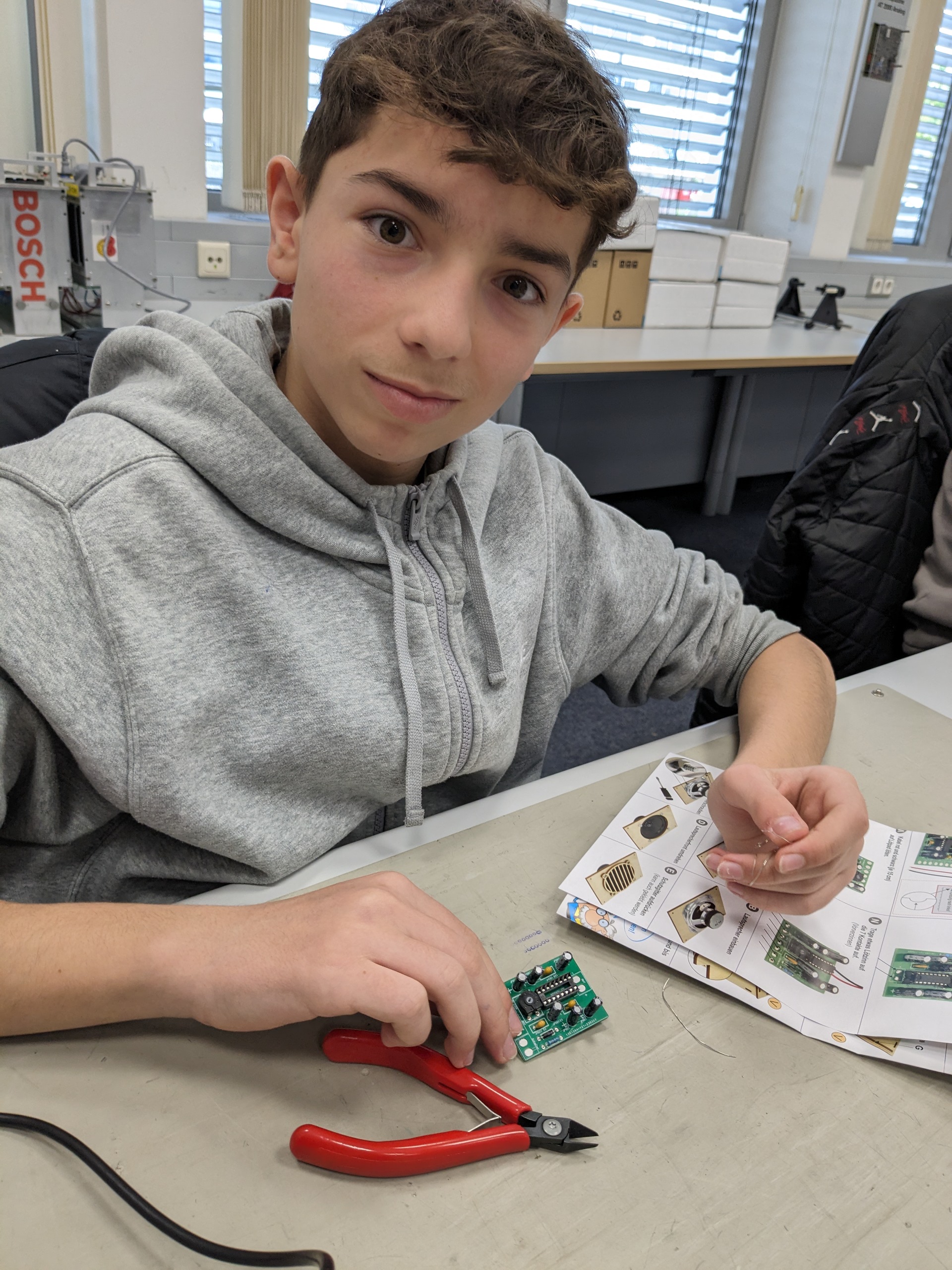 Nachdem wir vergangenes Jahr wieder unsere langjährige Kooperation mit der Firma BOSCH Sicherheitssysteme aufgenommen haben, ging es nach Corona in Runde 2. Wie jedes Jahr war es uns ein Anliegen interessierten Schülerinnen und Schülern einen Einblick in die Praxis zu ermöglichen. Hierzu haben sich folgende Schüler der 9. Klassenstufe Daniel Tumback, Ioannis Kiosses, Andy Ngo, Franco Sotrino, Vincenzo Storino, Furkan Al und Dijar Afizi für einen Besuch der Ausbildungsstelle Weilimdorf angemeldet. Vor Ort durften die Schüler eine Musik-Lautsprecher-Box selbst herstellen und im Anschluss daran auch mitnehmen. Beim Bau der Lautsprecherbox mussten die Schüler somit ihre praktische Fähigkeiten unter Beweis stellen. Das Löten einer Platine entspricht zwar weniger der täglichen Arbeit eines Elektronikers für Informations- und Systemtechnik – der Beruf den junge Erwachsene bei BOSCH ST lernen können – bietet aber eine gute Grundlage um wichtige Kenntnisse im Bereich der Elektronik aufzubauen.