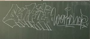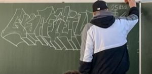 Danach ging es ans praktische Arbeiten. Mike erklärte Schritt für Schritt den Aufbau der Buchstaben, wie man sie zum „bouncen“ bringt und so einen 3D-Effekt erzeugt. Nachdem alle Schülerinnen und Schüler ihre Namen auf einem Konzeptpapier entworfen hatten, wurde alles auf Leinwände übertragen und bunt ausgestaltet.