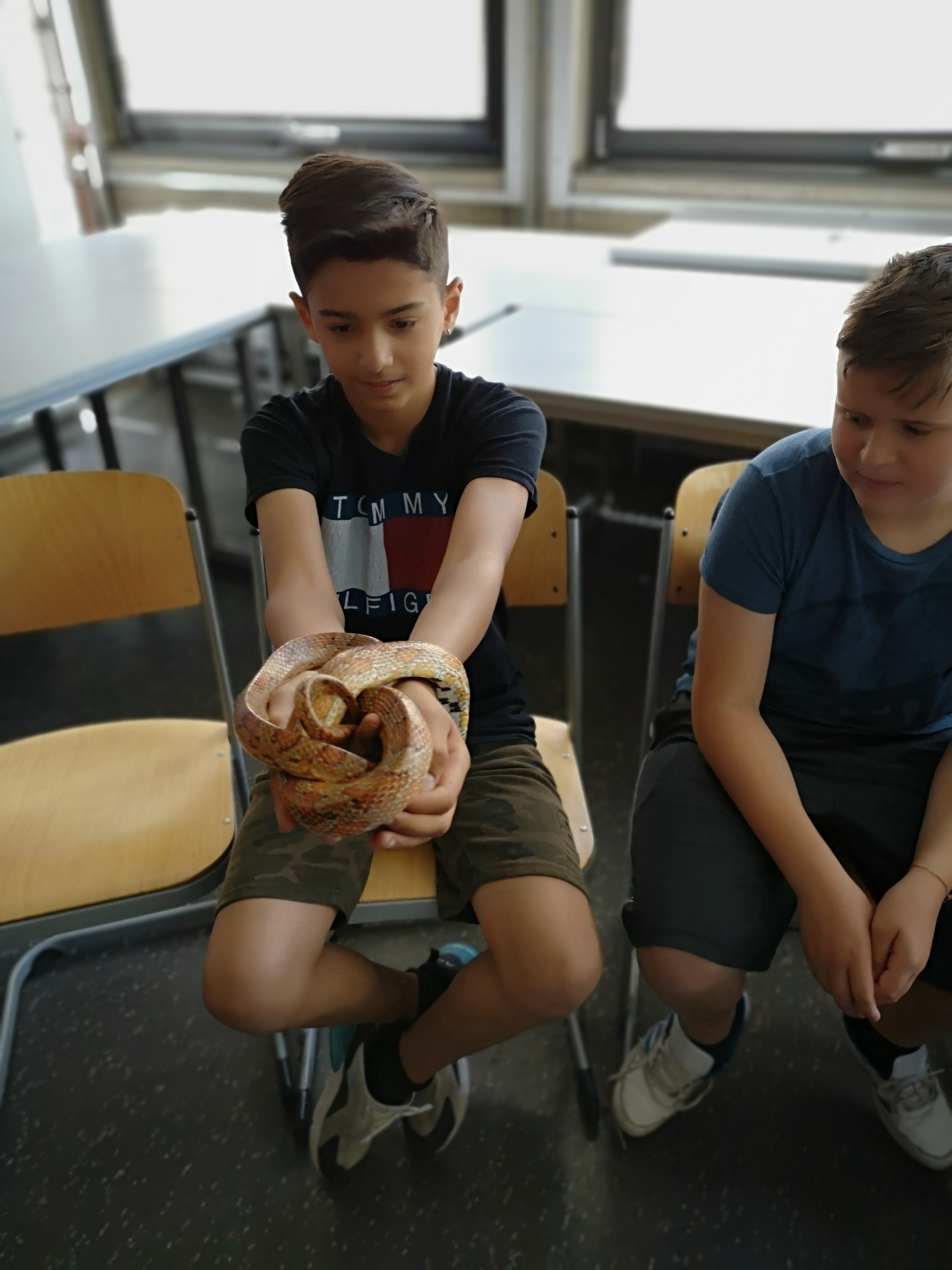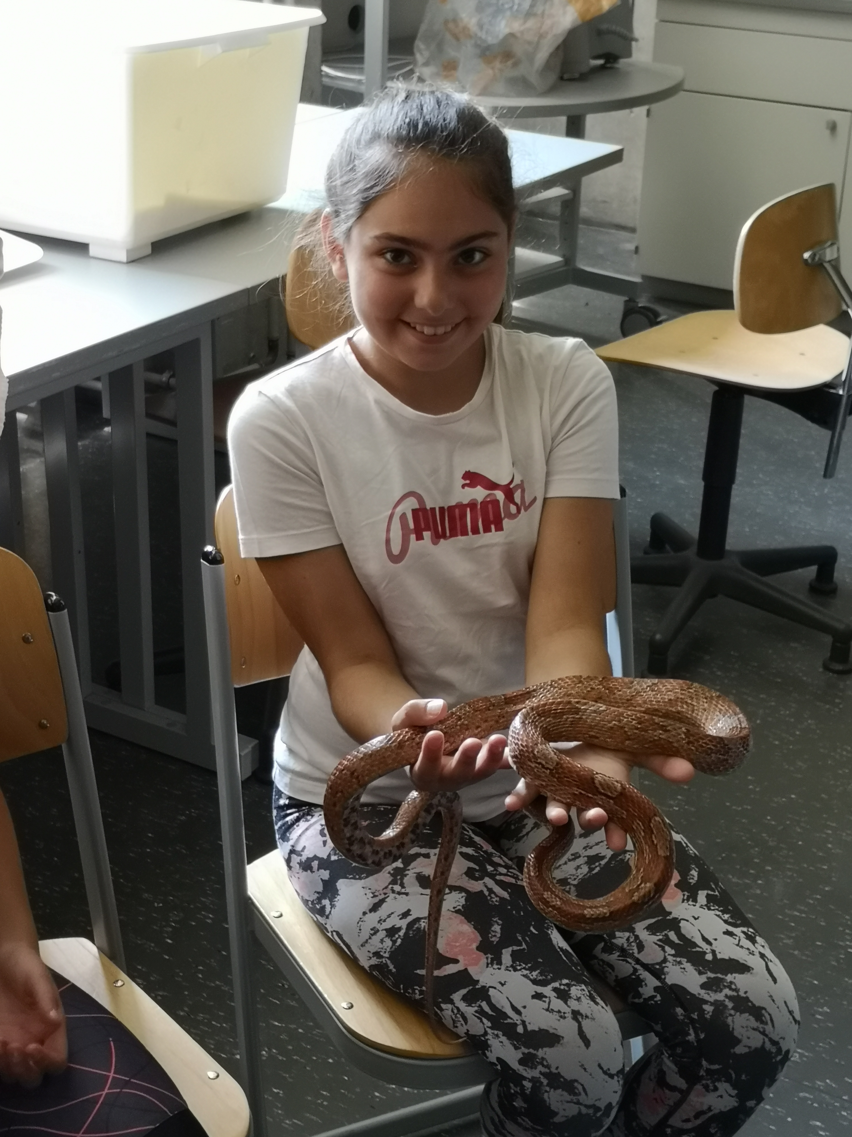 Im Anschluss daran besuchten wir einen Workshop der Fachschaft Biologie und lernten viel Interessantes über Amphibien und Reptilien, aber ohne langwierige Buchstunden und trockenes Pauken, sondern am lebenden Objekt. Die Kinder konnten mitgebrachte Kröten, Frösche und Schlangen in die Hand nehmen und Auge in Auge mit diesen faszinierenden Tieren alle Fragen loswerden, die sie interessierten.