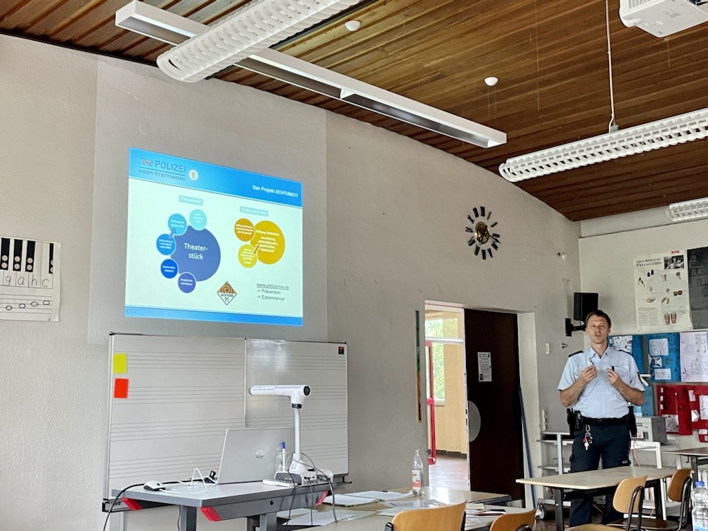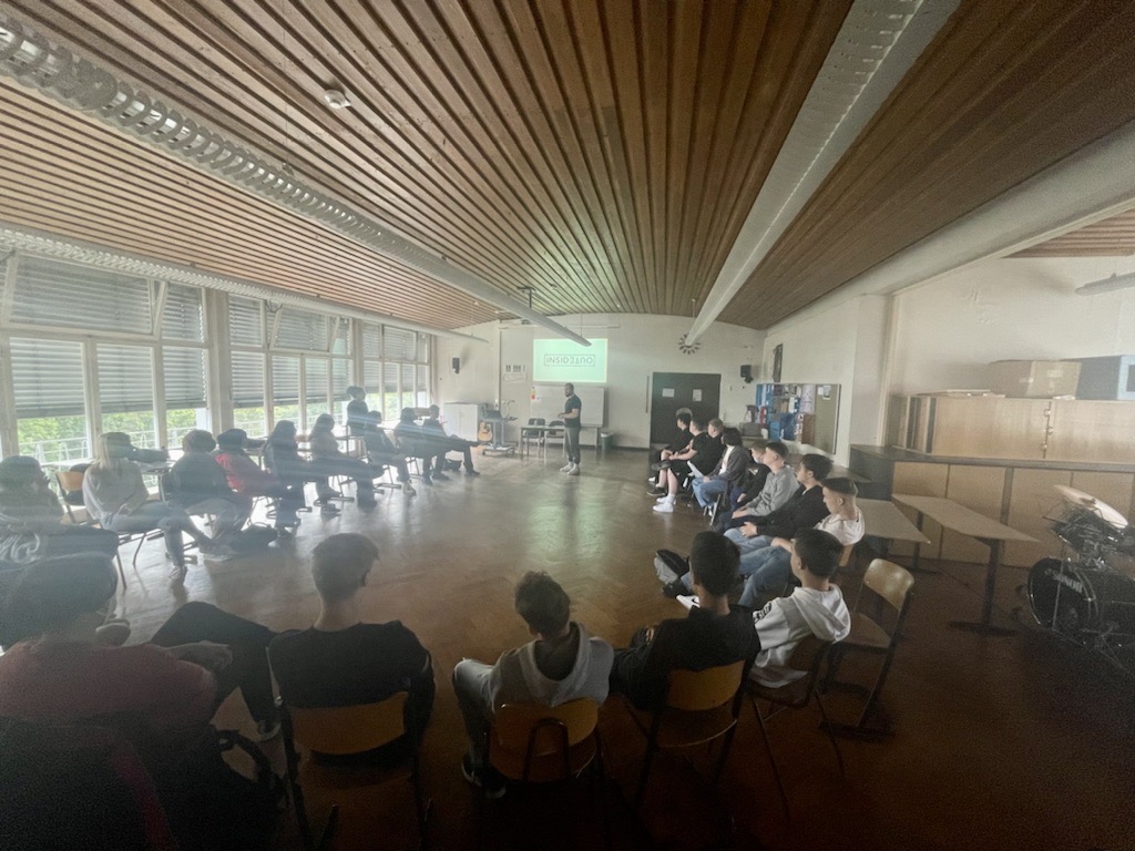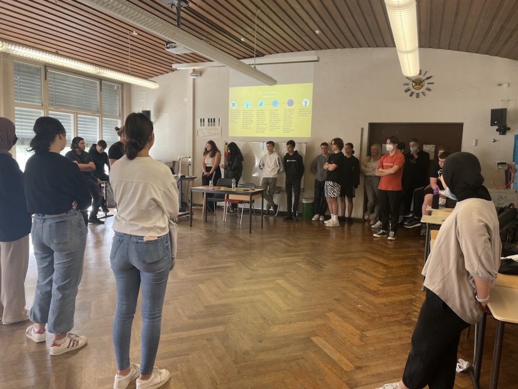 Die gesamte 9. Klasse nahm am Dienstag, den 5. Juli 2022 an einem interaktiven Theaterstück teil, das Bestandteil eines Präventionsprojekts gegen Extremismus ist. Dies geschah in Zusammenarbeit mit der Theatergruppe Q-rage und konex, dem Kompetenzzentrum gegen Extremismus des Landes Baden-Württemberg.