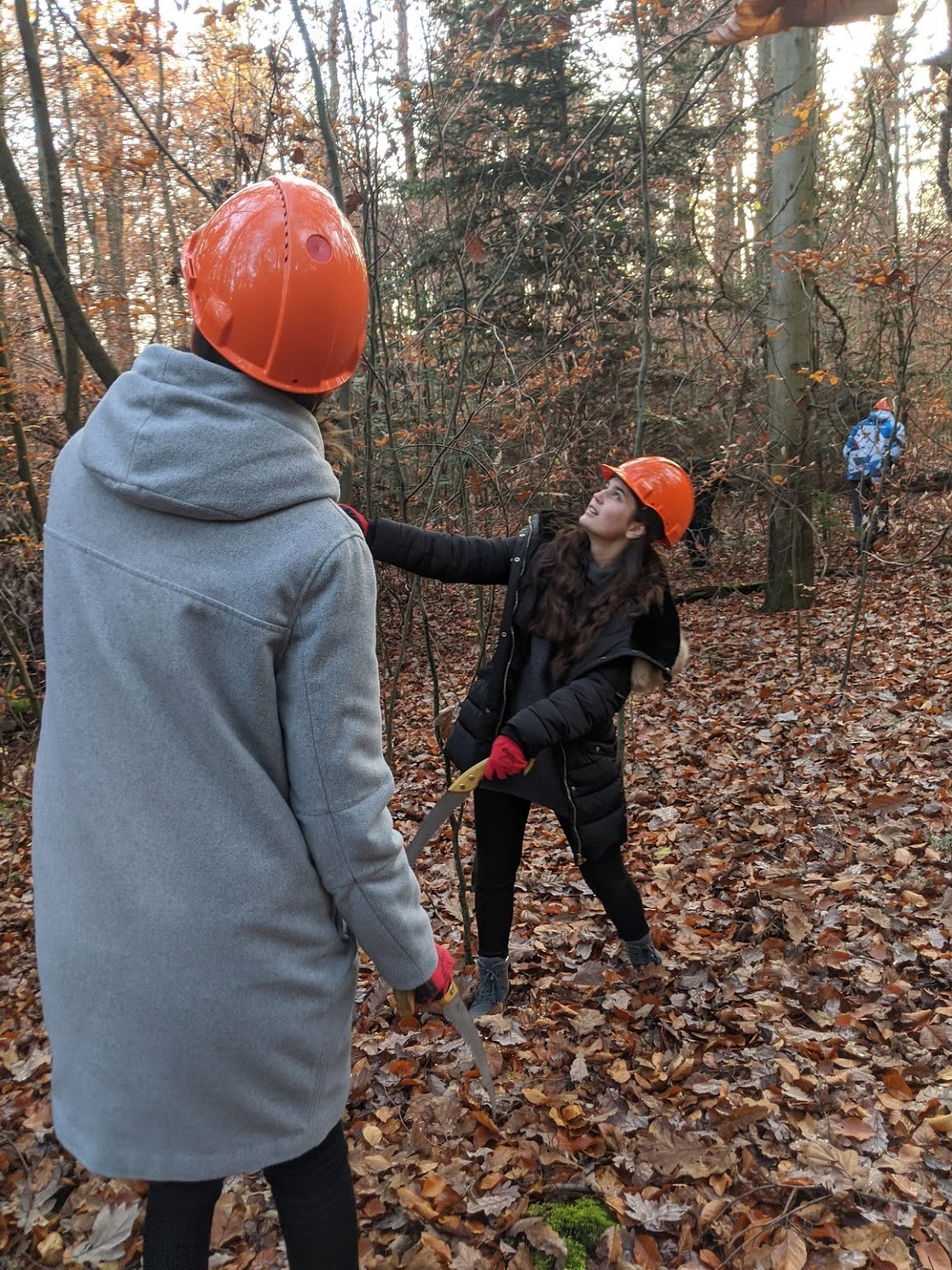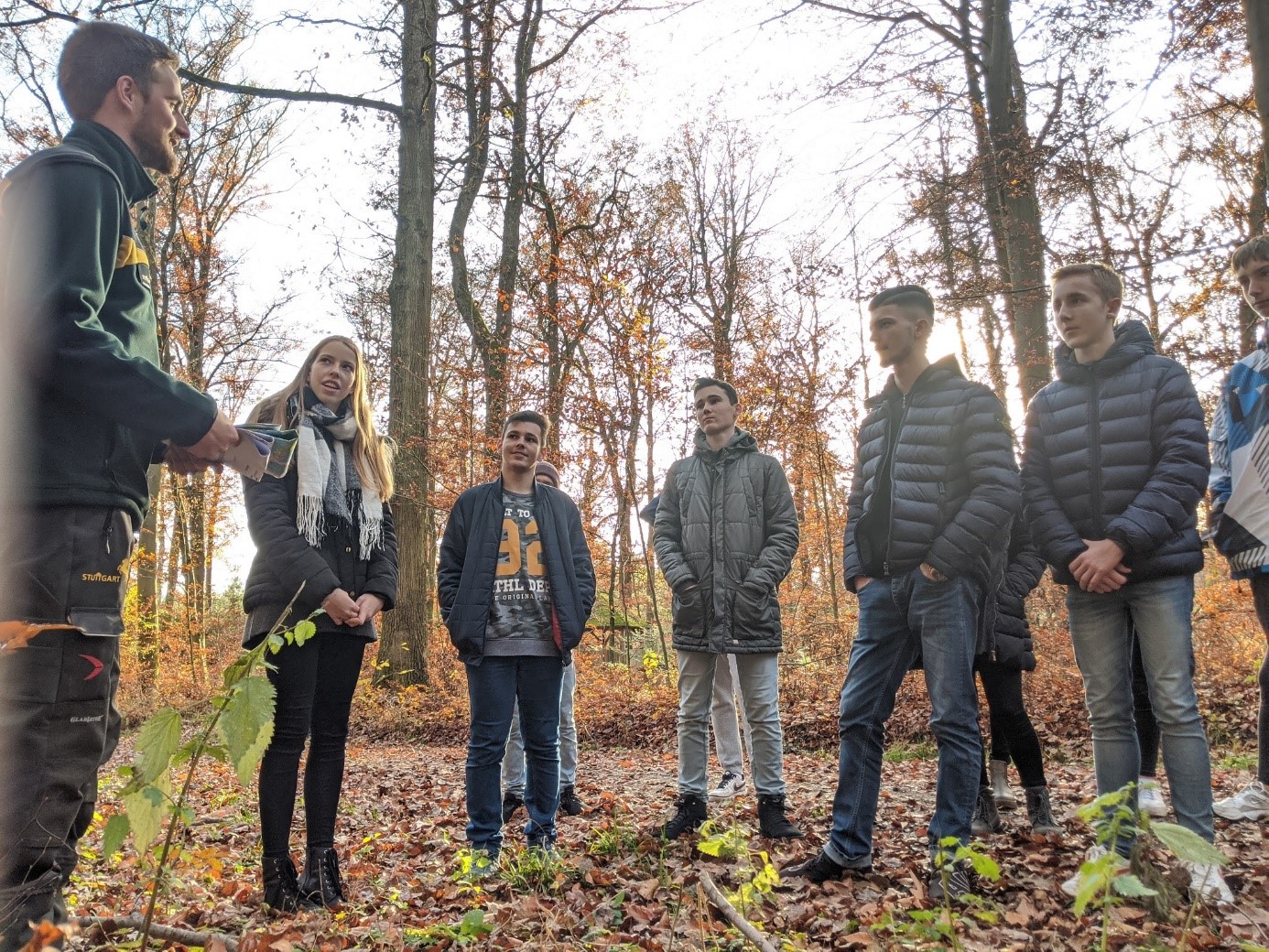 Die Biogruppe der Klassenstufe 10 war im Rahmen ihres Ökologie-Moduls auf Rettungsaktion im benachbarten Heimberg-Wald unterwegs. Die Schüler durften hierzu mit Helmen, Scheren und Sägen bewaffnet junge Buchenbäume im Radius von zwei Metern um junge Tannen fällen. So hat uns im Vorfeld Benjamin Schuldt, beauftragter Waldpädagoge der Stadt Stuttgart, eine Einführung in Sachen Umweltschutz, nachhaltige Forstwirtschaft und Waldarbeiten gegeben. So ist beispielsweise die Tanne, die einerseits unter dem Klimawandel leidet und andererseits von Buchen und Eichen überschattet wird in Stuttgarter Wäldern fast schon eine Rarität. Um die Artenvielfalt von Bäumen zu schützen, ist es deshalb immer wieder notwendig kleinere Baumgruppen von Tannen gegen die dominierenden Laubbäume Eiche und Buche im Stuttgarter Wald zu schützen.